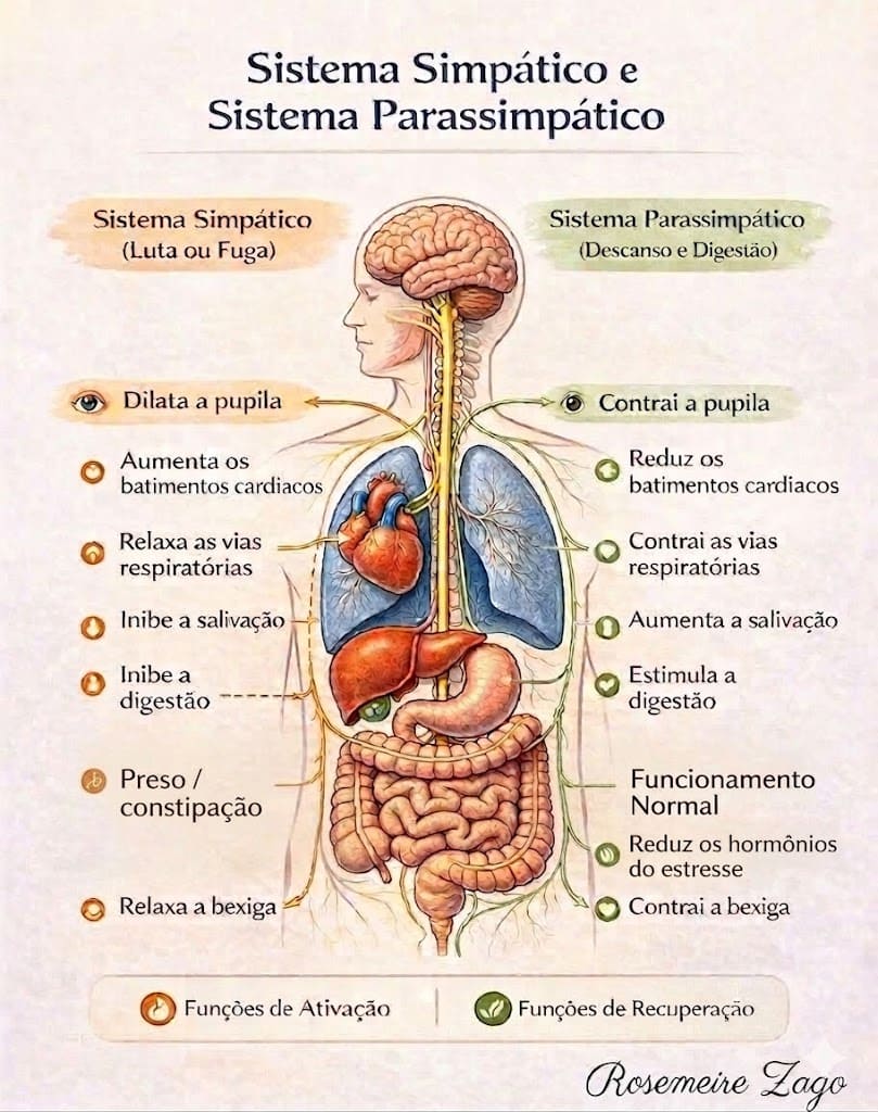 2. Sistema Parassimpático (Descanso e Digestão): Acalma e relaxa. Permite que o corpo relaxe, recupere energias e realize funções vitais com calma. É o freio do sistema.