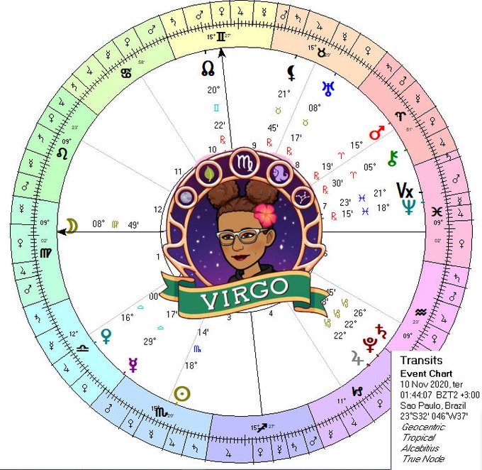 Lua aos 09º de Virgem e Vênus aos 16º de Libra indicando desafios + início de um novo período. Apontam, para o equilíbrio em Virgem, onde a escuridão e a luz deste feminino se encontram.