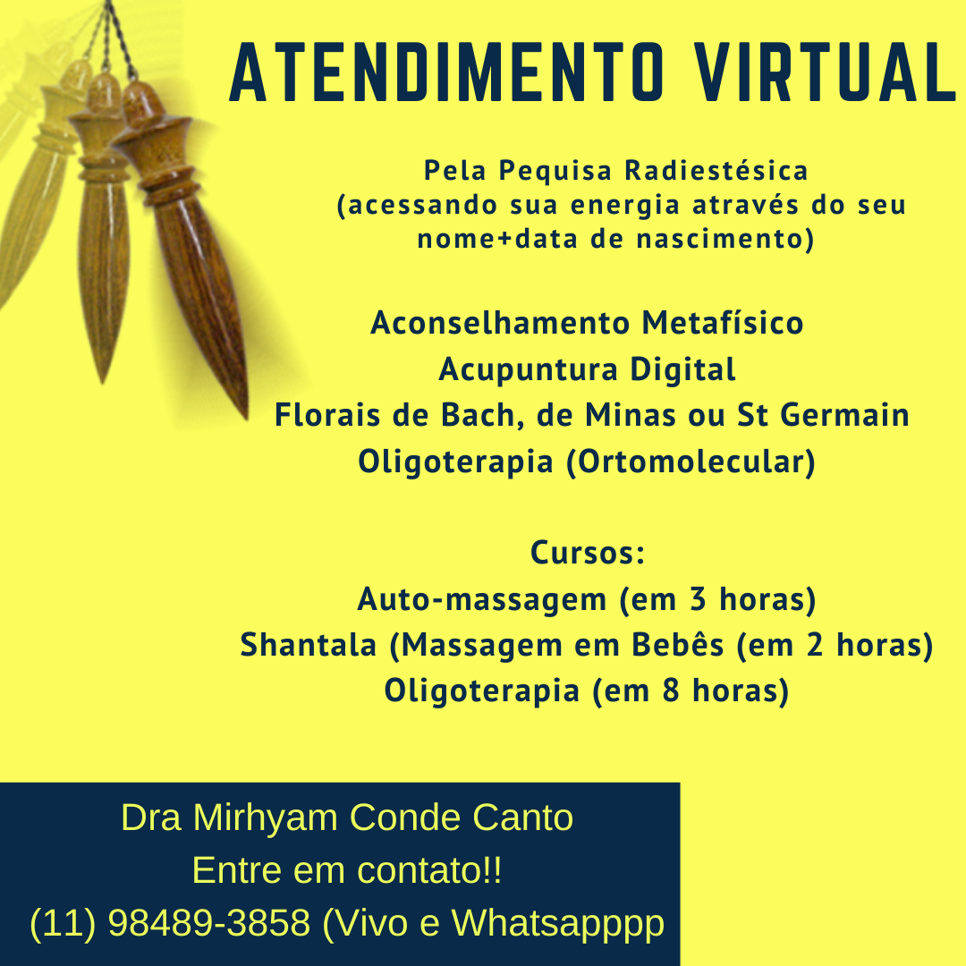 Essa maneira de atender oferece várias vantagens, entre as quais interagir com pessoas de outras cidades e estados!! Nessa consulra vurtual, primeiramente identifico através da sua energia, quais das terapias, a mais indicada para o seu momento...