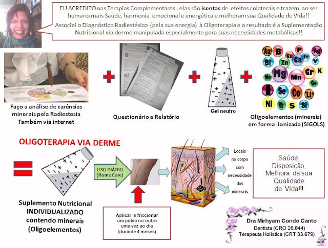 A suplementação de minerais é uma maneira rápida e eficaz de devolver a saúde ao seu metabolismo. Nos meses de Novembro e dezembro, estou realizando a análise de suas carências minerais com valor reduzido e proponho a suplementação dos 5 minerais mais necessários ao SEU metabolismo - para uso diário - aplicando o gel nos pulsos - pelo período de 4 meses!!